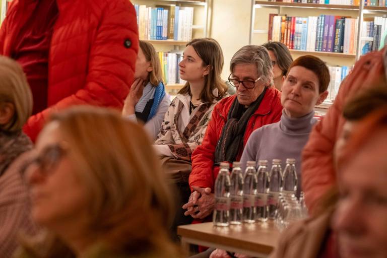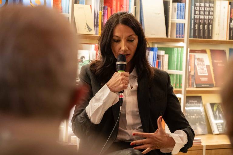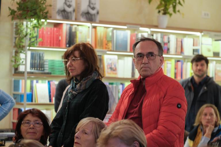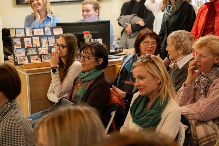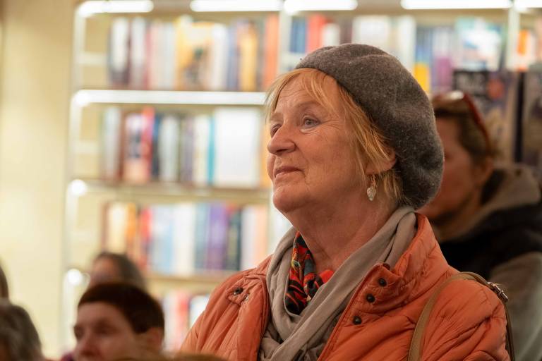 Ob prvi obletnici delovanja je bila knjigarna polna. Čander se je pogovarjal z osrednjo gostjo večera – publicistko in pisateljico Vesno Milek.