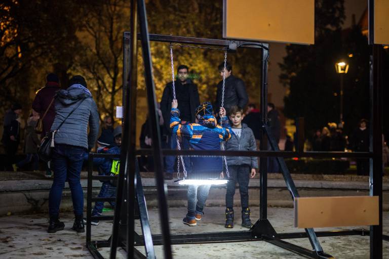 Na Slomškovem trgu nas Elektrificirana glava s svetlobno gugalnico zaziba v razigranost, z občutkom razposajenosti in zadovoljstva pa povabi, da v svet in vesolje pošljemo sporočilo dobre volje.