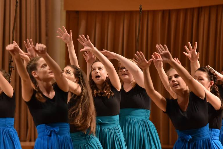 Precej bolj razigran je bil nastop Dekliškega pevskega zbora Aglaja iz Radelj ob Dravi, ki je pod vodstvom Kerstin Pori in Uroša Jurgeca predstavil živahne afroameriške ritme. Afriško petje kar kliče po gibu in tudi mlade pevke, oblečene v dolga modra in turkizna krila, so na odru uprizorile iskrivo kombinacijo petja in plesa.