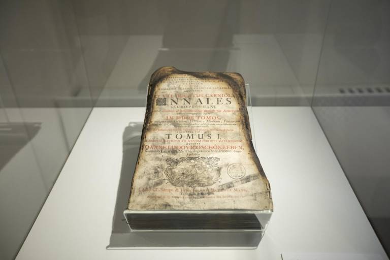 Nekaj gradiva, prikazanega na razstavi, lahko vidimo prvič, med drugim so to nedavno odkrite fotografije slovesnosti ob začetku gradnje NUK iz leta 1936 ter fotografije, ki so nastale takoj po strmoglavljenju letala in dajejo vpogled v nastalo škodo. Razstavljenih je tudi nekaj rešenih in ožganih knjig ter ohranjeni kosi nemškega letala.