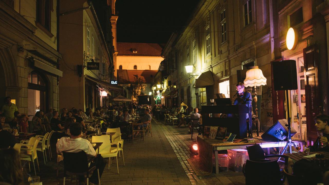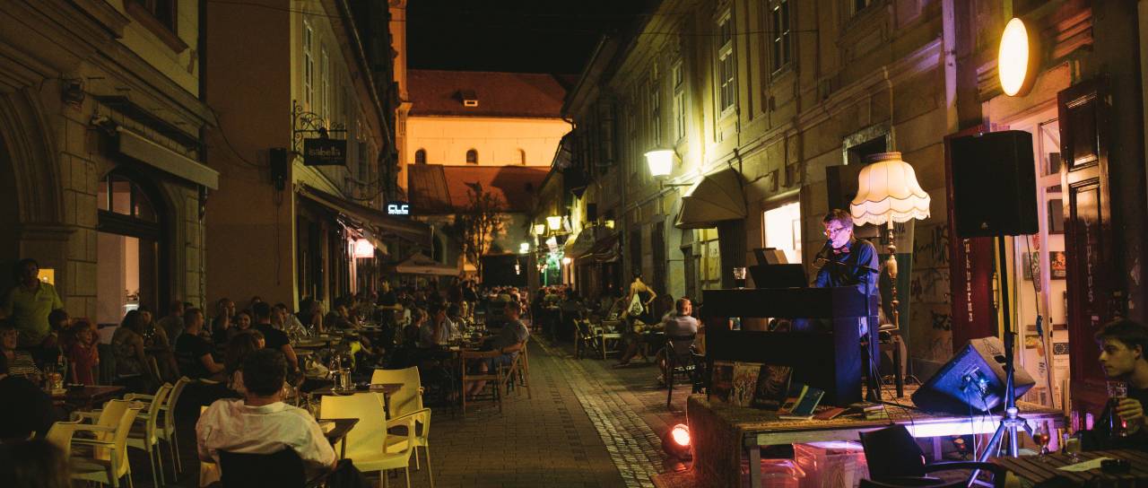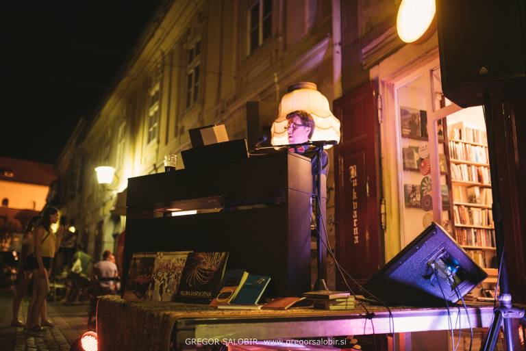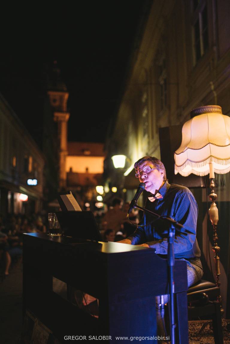 Aranžer glasbe, dirigent, instrumentalist, pedagog in vokalist Samo Ivačič je včeraj na Poštni ulici v tretjem četrtkovem večeru v ciklu SOLO SOLO na klavinovi pred Bukvarno Ciproš kot Orion obsijal temno in vročo poletno noč.