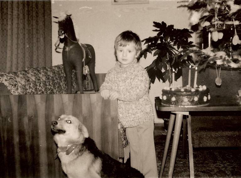 »Tretji rojstni dan v šolskem stanovanju nad Donačko goro v družbi našega psa Civila, ki je dobil ime po psu Civilu iz detektivske serije na televiziji. Čez čas smo sicer ugotovili, da nimamo Civila, ampak Civilo, ki je bila naš prvi ljubljenček. Še danes imam doma psa. Leseni konjiček za mano se danes nahaja v našem muzeju v zbirki otroško življenje.«