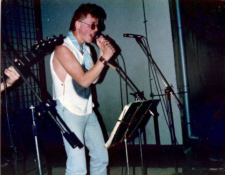 »Pankerji za dan mladosti! 1987 v skupini Sing Sing. Egon je na kitari, Dimek je na bobnih, na basu pa je Boris Kidrič, ki danes igra v narodno-zabavnem ansamblu Aplavz. Tukaj smo na nastopu v Šmarju za dan mladosti. Do takrat smo že posneli dve avtorski skladbi v studiju, Dom cesarjev in Železni križec, ki sta bili precej infantilni, a sta imeli precej politični besedili o nasprotovanju avtokraciji. Lahko bi rekli, da smo se malček šli pankerje. V prvi vrsti so sedeli vojaški oficirji, ki so se pobrali že med uvodno skladbo.« (smeh)