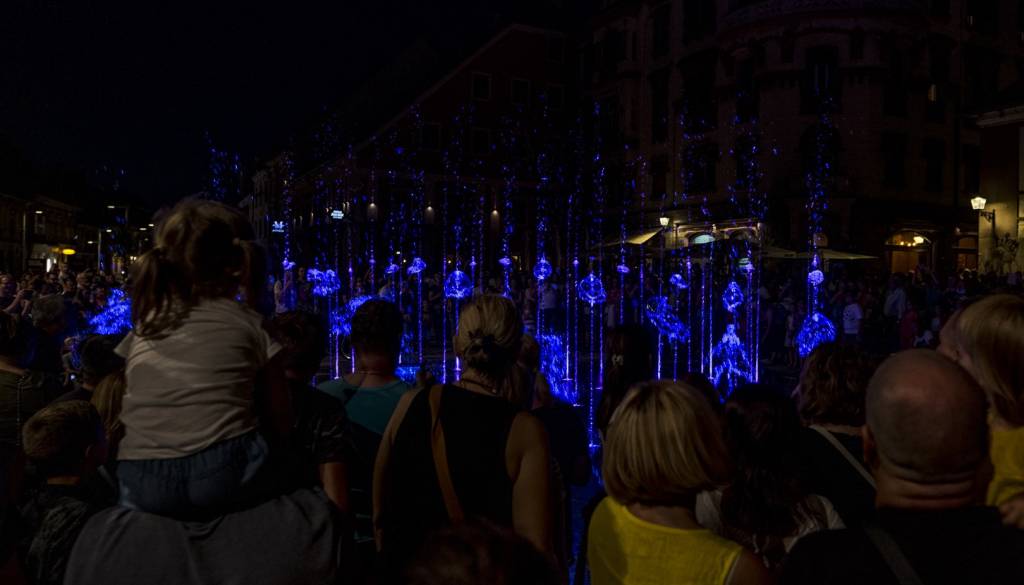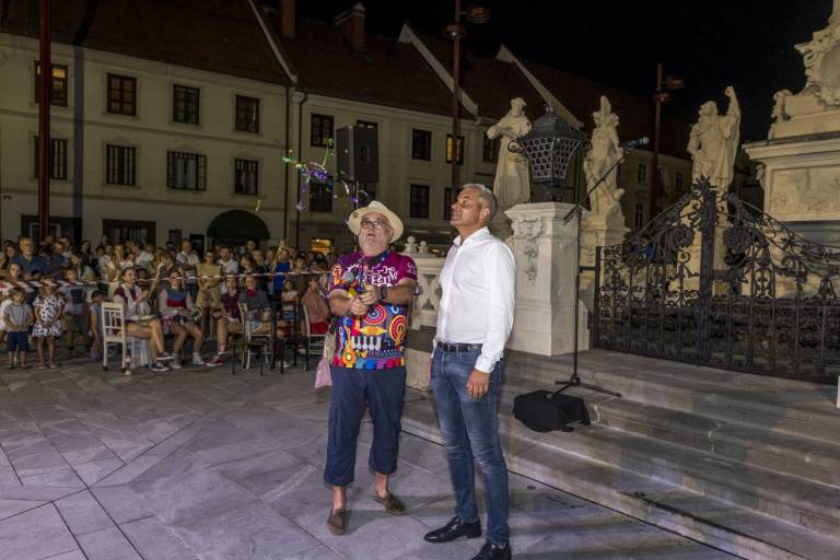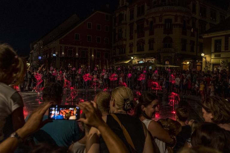 Poletni petkov večer v mestu je bil danes še toliko bolj poseben, predvsem zaradi prvega prižiga luči in vklopa mavrične fontane na Glavnem trgu.