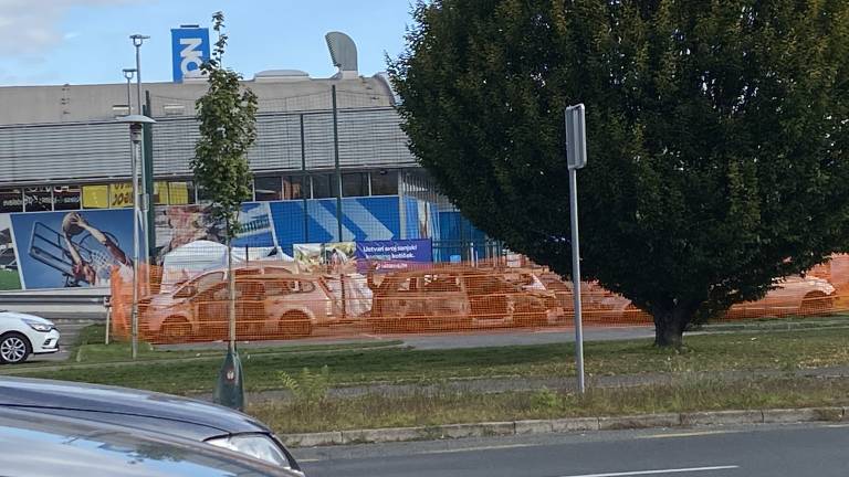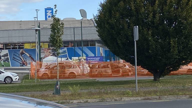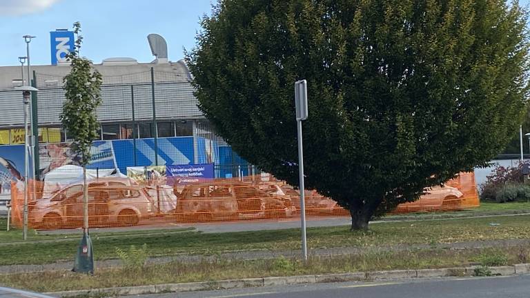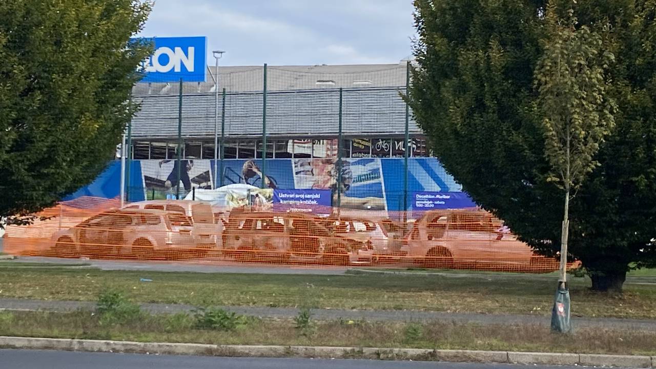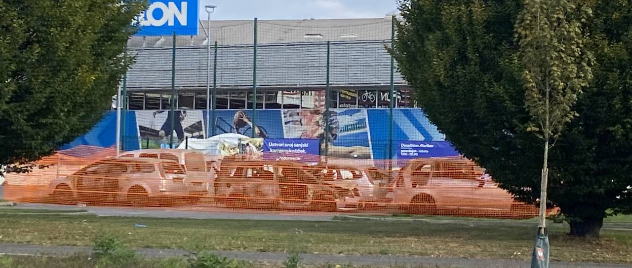 Uničene avtomobile so premaknili na zunanje parkirišče in jih ogradili z začasno oranžno ograjo.