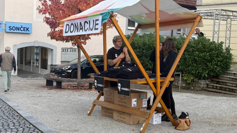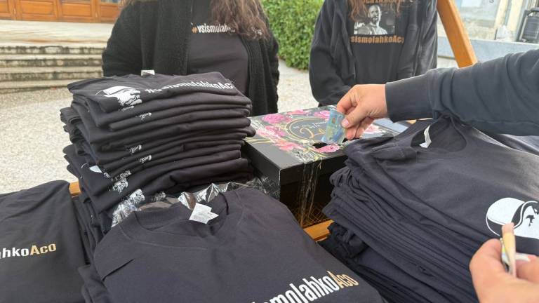 16.03 Na stojnicah ponujajo majice in šilt kape #vsismolahkoaco ter zbirajo prostovoljne prispevke oziroma donacije za družino pokojnega. Protestniki, ki se zbirajo, nosijo majice Acotu v čast z napisom Vsi smo lahko Aco.