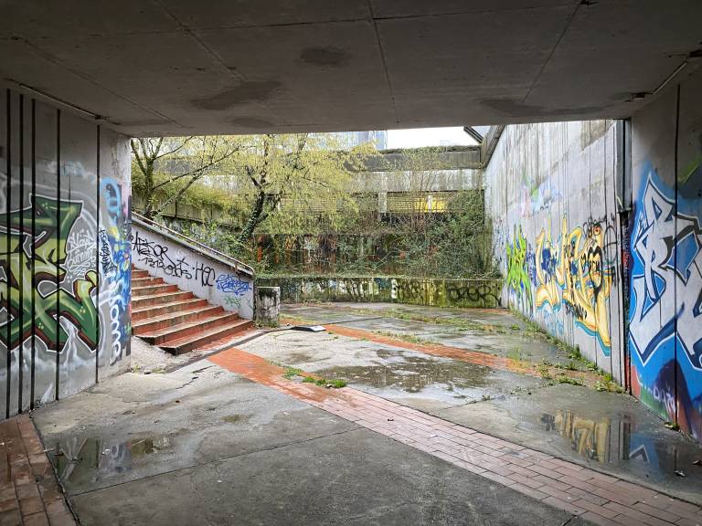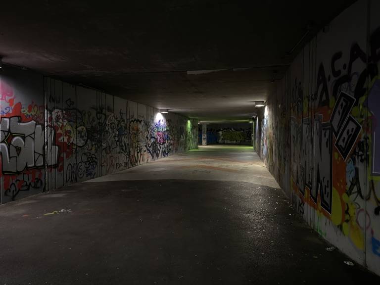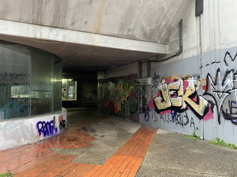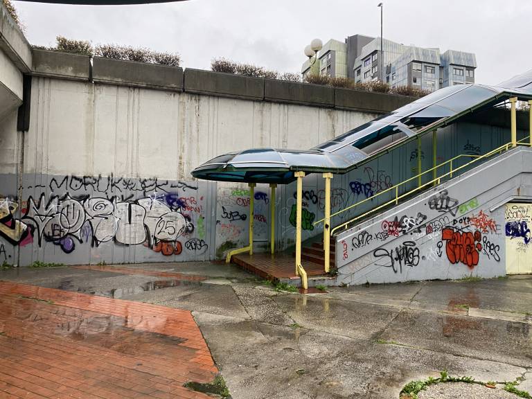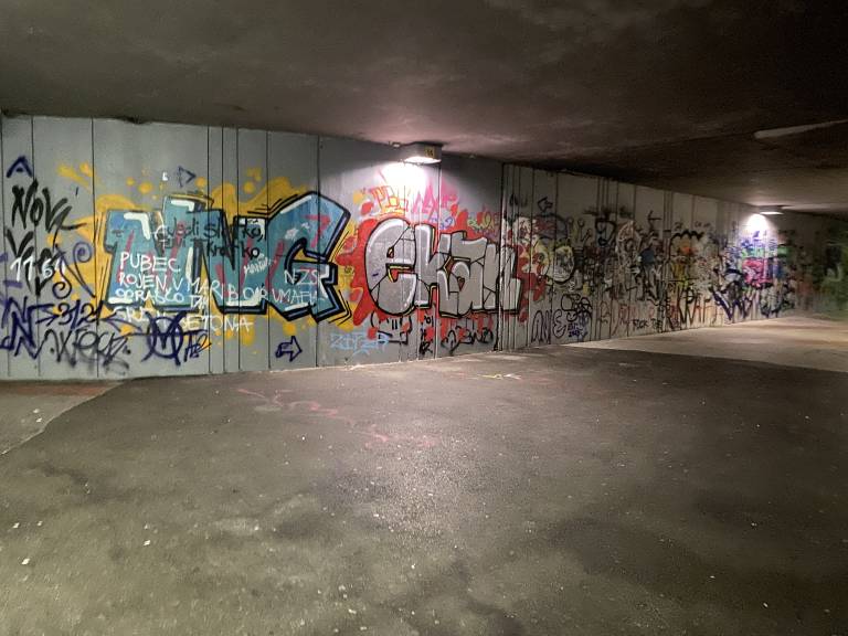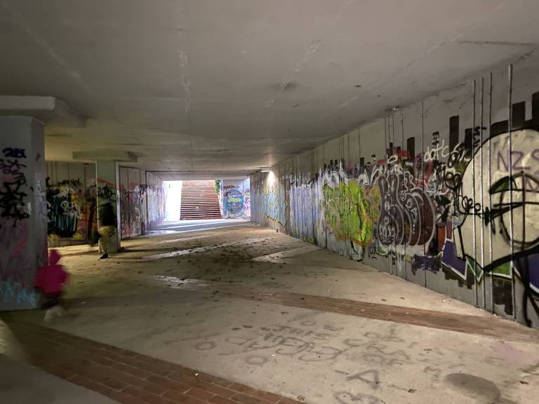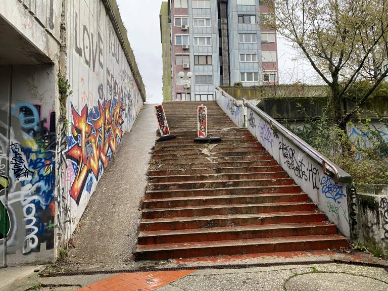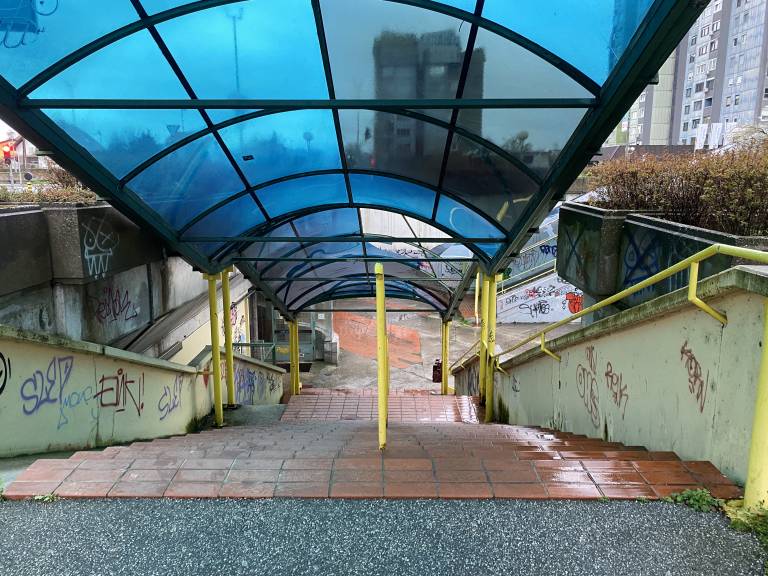 Do nje vodi stopnišče, ob katerem rjavi rumena ograja, stene pa so preplavljene z grafiti, ki segajo tudi v podhod pod cesto.