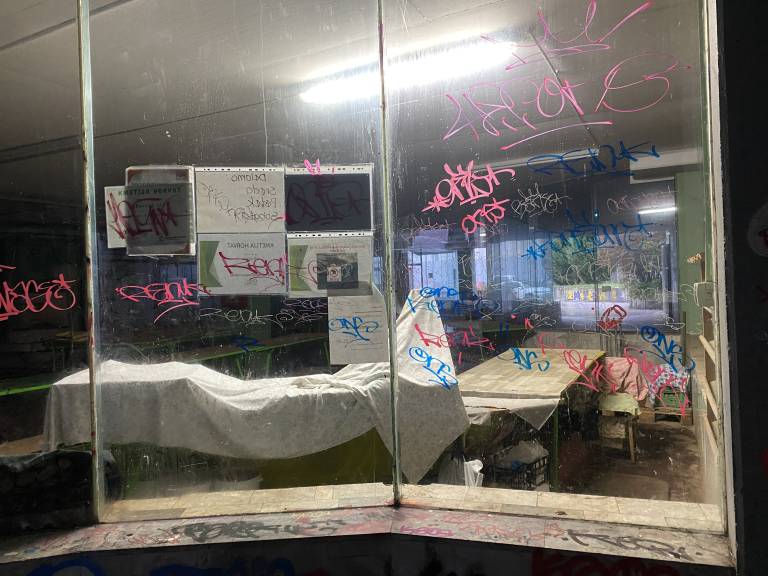 Prodajni prostori so zdaj zatemnjeni, za prašnimi stekli so komaj vidne mize, pregrnjene z umazanimi platni, vse pa dodatno kazijo napisi in poškodbe.