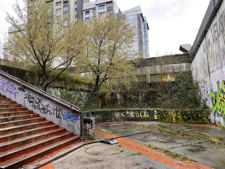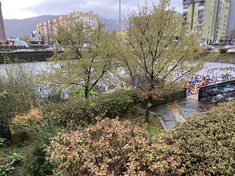 Okolica je prav tako zapuščena – zaraščena drevesa segajo preko poti, klopi so prevrnjene ali polomljene, oglasni panoji zanemarjeni.