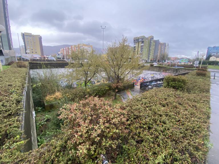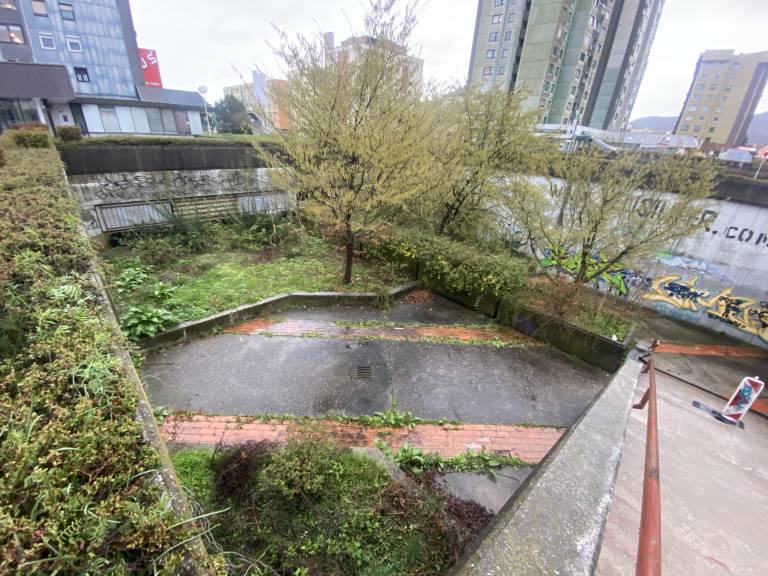 Zgornji plato, ki ga še krasi nekaj zelenja, sicer ponuja potencial za prostor druženja, a trenutno ostaja neprivlačen in zapuščen.