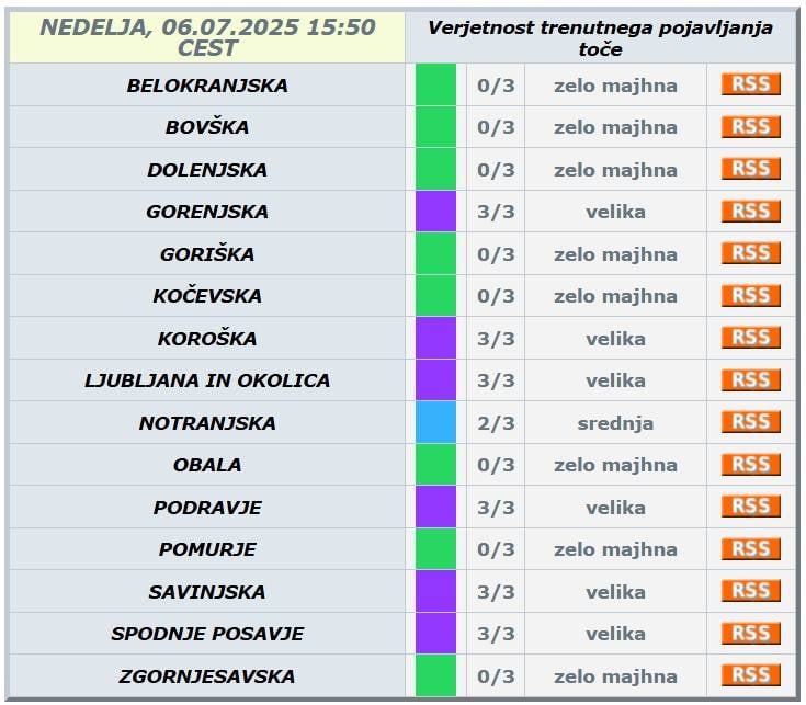 Agencija Republike Slovenije za okolje je Gorenjsko, Koroško, Ljubljano z okolico, Podravje, Savinjsko in Spodnje Posavje izdala vijoličasto opozorilo za veliko verjetnost trenutnega pojavljanja toče.