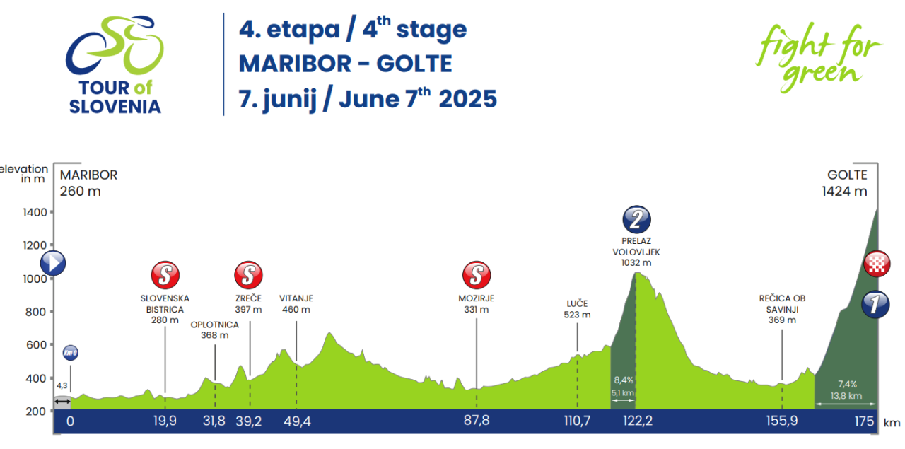 Etapa, dolga 175,2 kilometra, se bo začela ob 10.20 v Mariboru in zaključila med 14.39 in 15.20 na Golteh. Na trasi bodo trije leteči cilji in dva zahtevna kategorizirana vzpona.