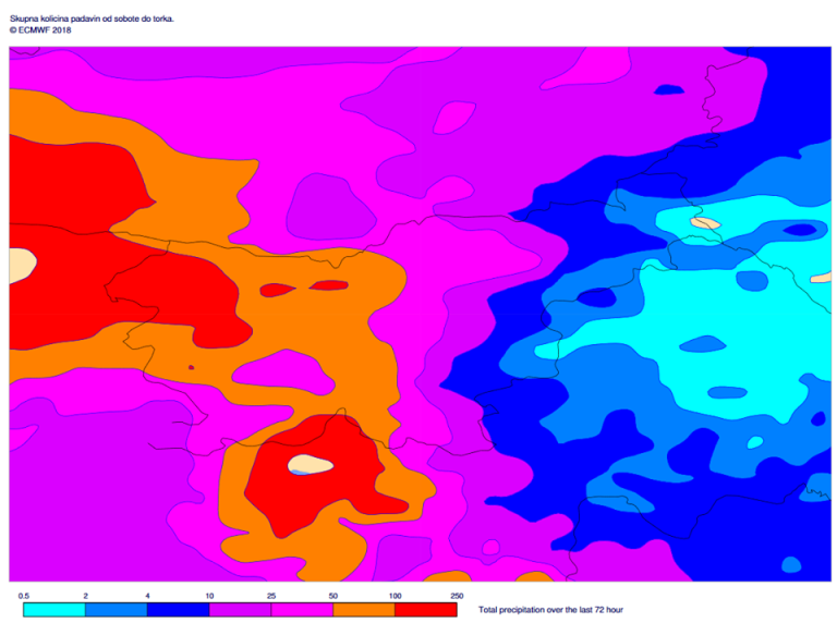 V celotnem padavinskem obdobju lahko pade v zahodni Sloveniji od 150 do 300, krajevno predvsem v zgornjem Posočju lahko do 400 litrov dežja na kvadratni meter, v osrednji in južni Sloveniji pa od 100 do 200 litrov na kvadratni meter. V nekaj dneh bo padla povprečna mesečna količina padavin za okober.