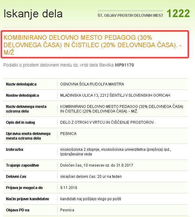 Na Osnovni šoli Rudolfa Maistra v Šentilju v Slovenskih goricah iščejo osebo univeritetne izobrazbe po drugi stopnji, ki je precej vsestranska in bi opravljala tudi delo, za katerega ni pridno študirala več let. Oseba naj bi delala tako z otroci kot tudi čistila prostore. 30 odstotkov delovnika naj bi tako opravljala delo pedagoga, 20 odstotkov dela pa bi zajemalo čiščenje prostorov, gre namreč za polovični delovni čas.