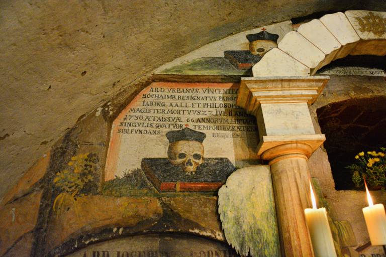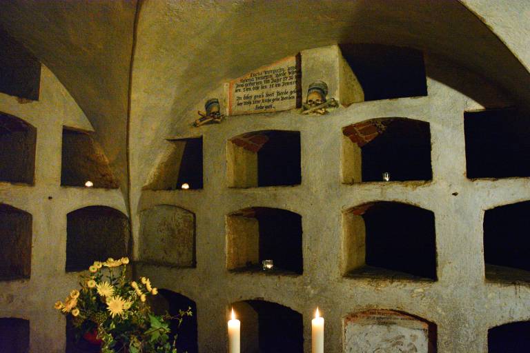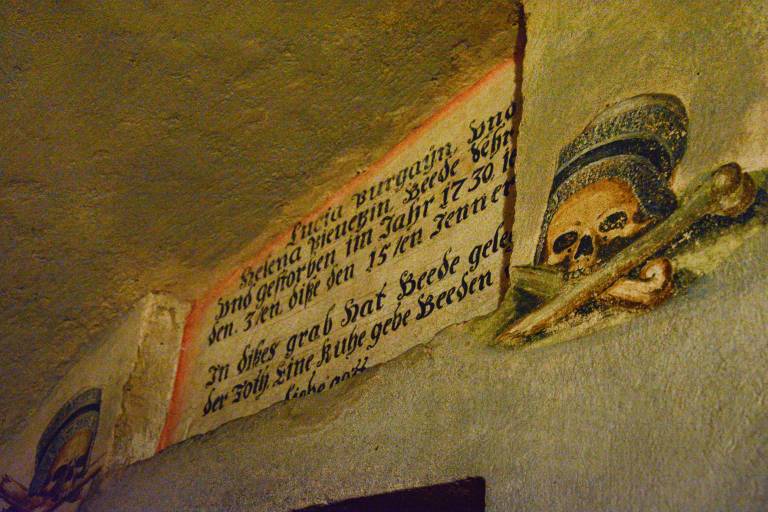Tik za oltarjem je častno mesto z desetimi grobimi nišami. Da gre za duhovnike dokazujejo tudi barvne poslikave lobanj z rdečimi in črnimi bireti oziroma duhovniškimi pokrivali.