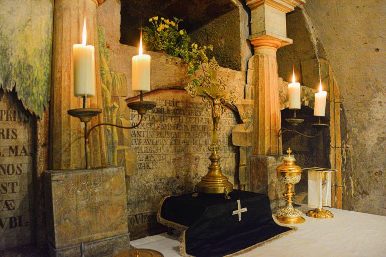 V sprednjem delu katakomb, ki se nahajajo pod skoraj celotno površino cerkve, je postavljen kamnit oltar Sv. Križa z vzidanimi relikvijami.