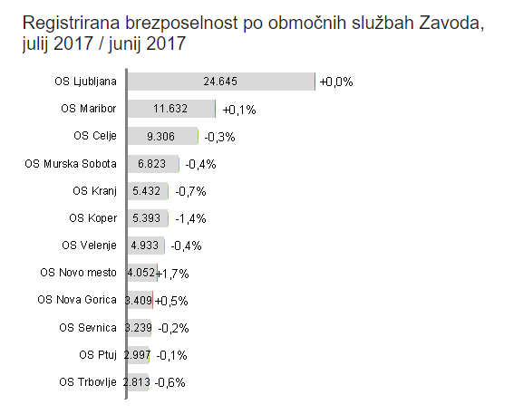 Tako se je v letošnjem letu vključno z julijem v Sloveniji na novo prijavilo 2672 ljudi, od tega 426 v Mariboru. Iskalcev zaposlitve je bilo 336 in 70 tistih, katerih zaposlitev je bila/je ogrožena; odjavilo pa je 360 oseb (obdobje januar–julij 2017).
