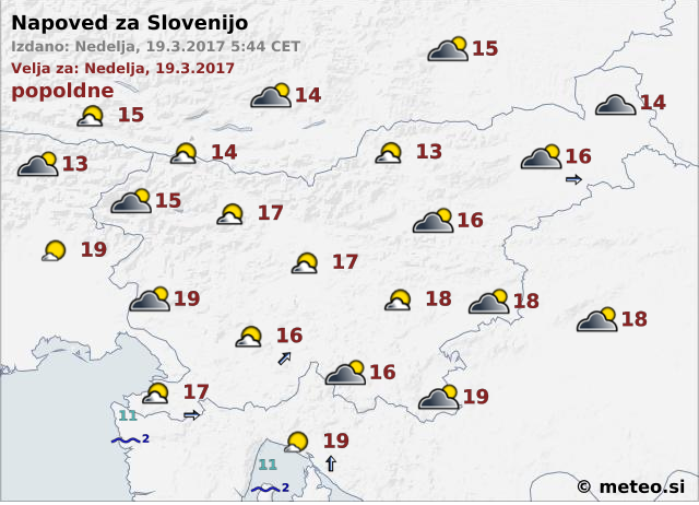 Ponekod bo pihal zahodni do jugozahodni veter. Najnižje jutranje temperature bodo do 7, najvišje dnevne se bodo lahko spustile vse do 21 stopinj Celzija, napoveduje Agencija RS za okolje (ARSO).