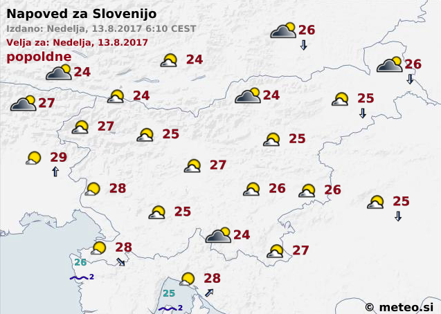 Vremenoslovci za danes napovedujejo dokaj sončno vreme, predvsem v vzhodni polovici Slovenije bo občasno nekaj več oblačnosti. Najvišje dnevne temperature bodo od 24 do 28 stopinj.