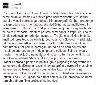 Na odgovore, kako so se (če sploh) glede dotičnih stavb odločili na ministrstvih za kulturo in upravo, še čakamo in jih bomo objavili, takoj ko jih prejmemo. Na socialnem omrežju Facebook so se pa oglasili fantje iz Udarnika, ki imajo o usodi kina svoje mnenje.