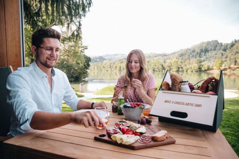 Novinarka ne more skriti navdušenja: »Vsako jutro vam bodo do vrat hiške dostavili svež zajtrk z lokalnimi izdelki in tako se boste med drugim sladkali z granolo, skuto v obliki srca, salamo in šampanjcem. Lahko boste izbirali med zdravim in čokoladnim zajtrkom za prave čokoladne odvisnike, ki vključuje tudi čokoladni sir in čokoladno salamo.«