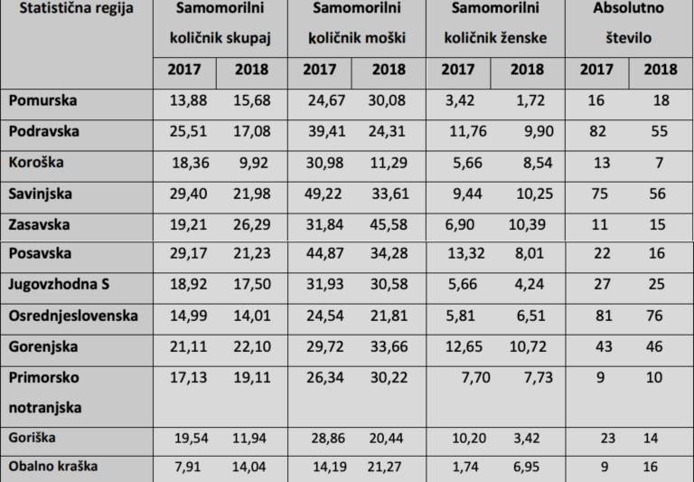 Samomorilni količnik, ki so ga v Sloveniji zabeležili v letu 2018, je sicer najnižji samomorilni količnik v zadnjih dveh desetletjih in tudi sicer najnižji od leta 1965 naprej.