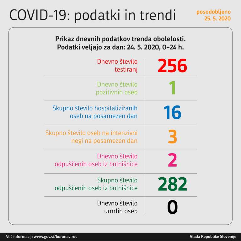 Včeraj, 24. maja, so v Sloveniji opravili 256 testiranj na novi koronavirus. Od teh je bil en test pozitiven na koronavirus. Skupno število vseh okužb je tako 1469.