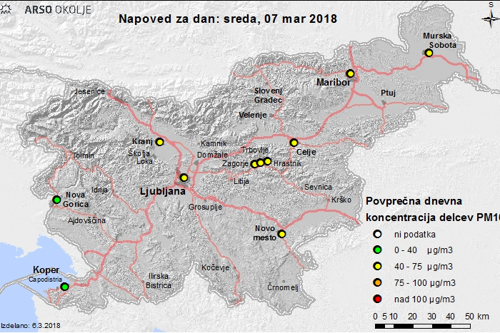 Najvišje ravni onesnaženosti zraka z delci lahko pričakujemo v večjih urbanih središčih, kjer je prisotnih veliko virov onesnaževanja zraka - promet, industrija, kurišča. To so predvsem Celje, Kranj, Ljubljana, Murska Sobota, Novo mesto, Zagorje, Trbovlje, Hrastnik in pa Maribor.