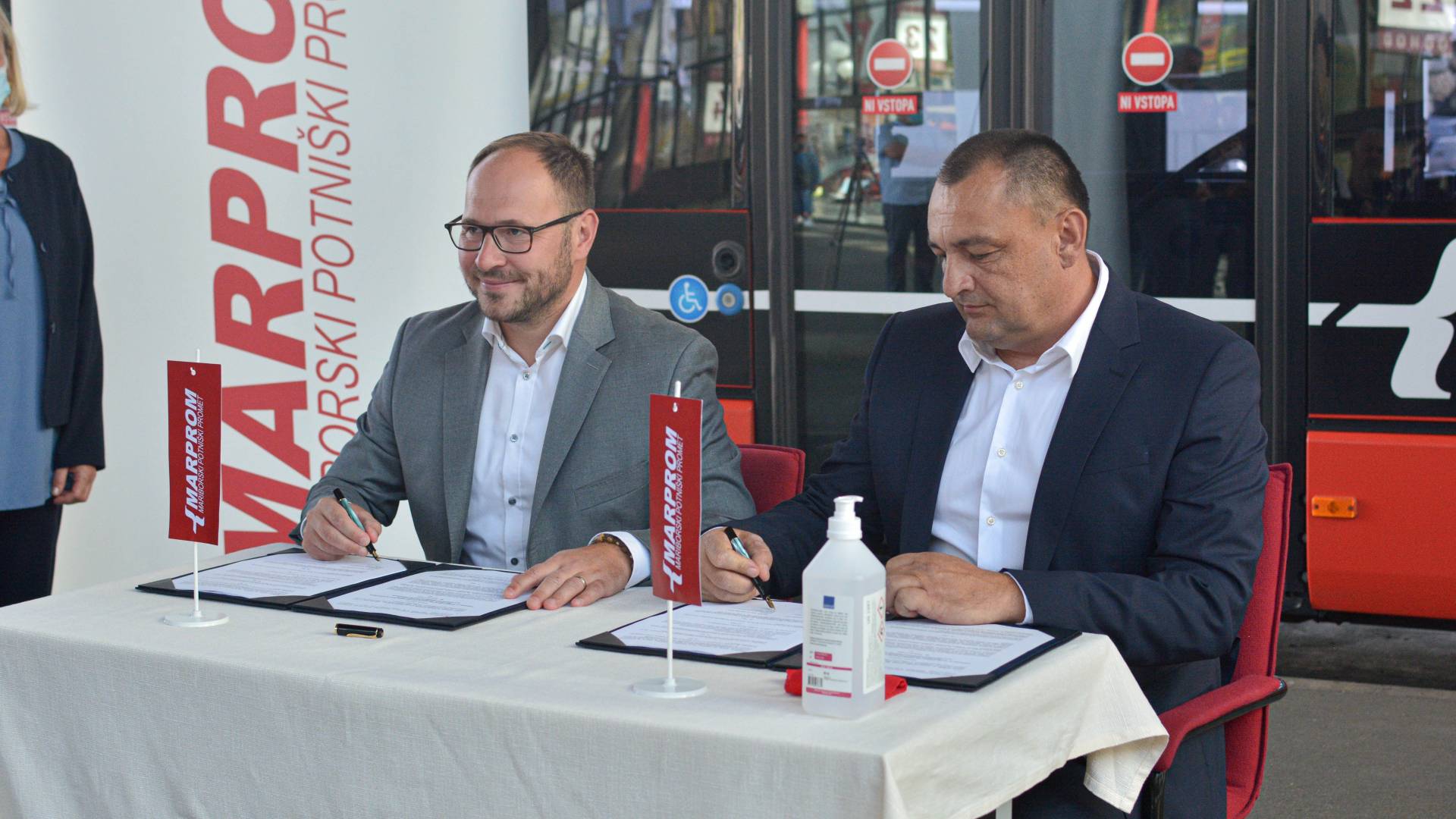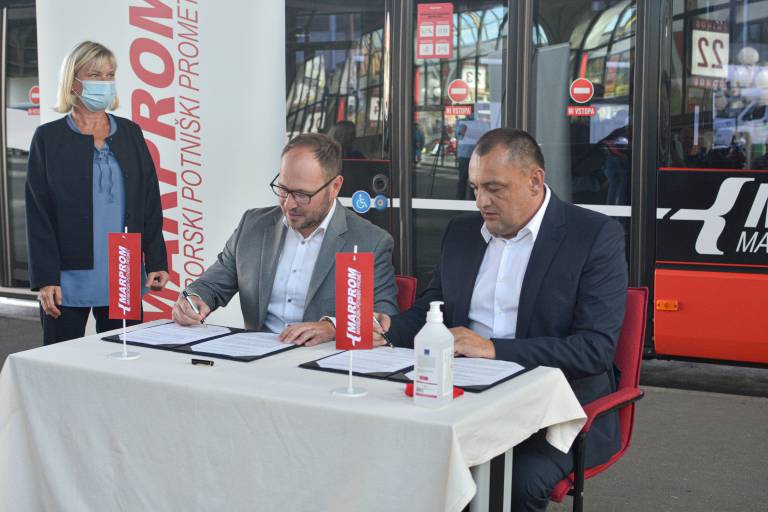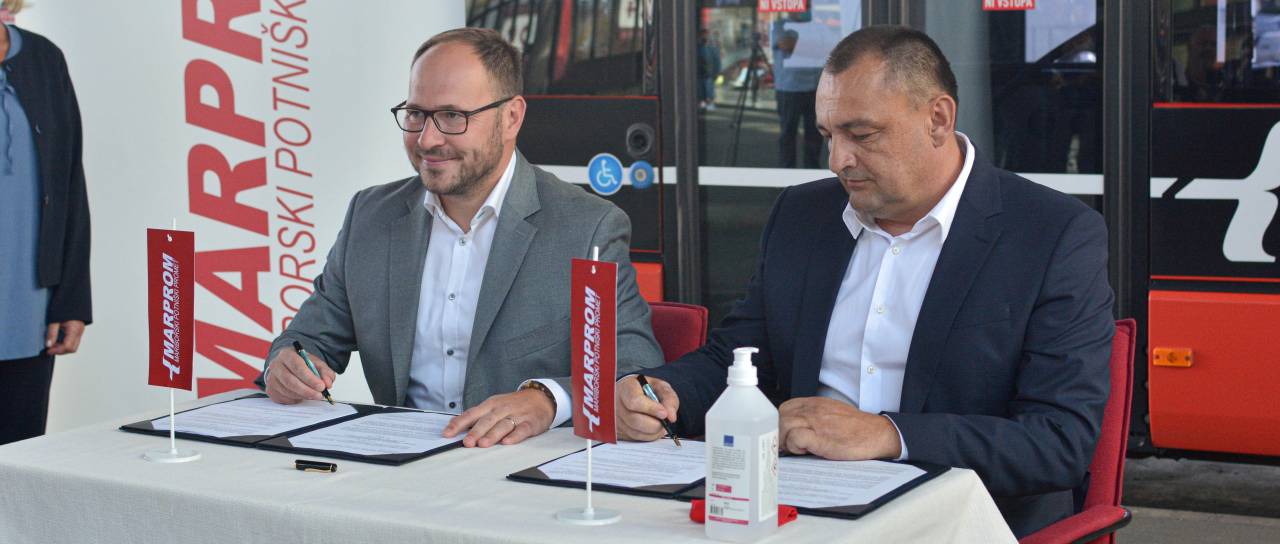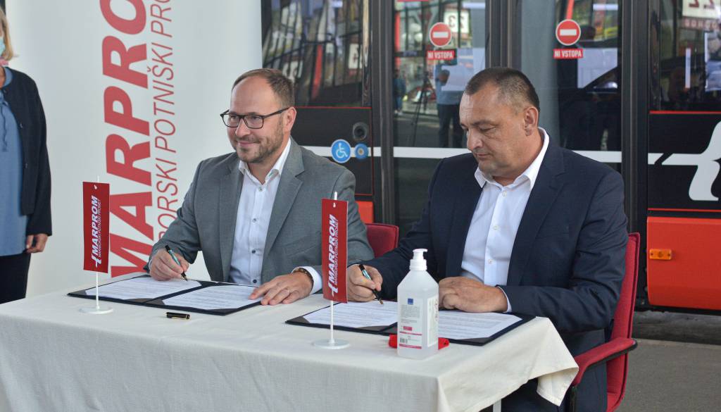 Vrtovec in direktor Marproma Bernard Majhenič sta podpisala pogodbo, ki določa brezplačen potniški promet za upokojence, vojne veterane, invalide in starejše nad 65 let.