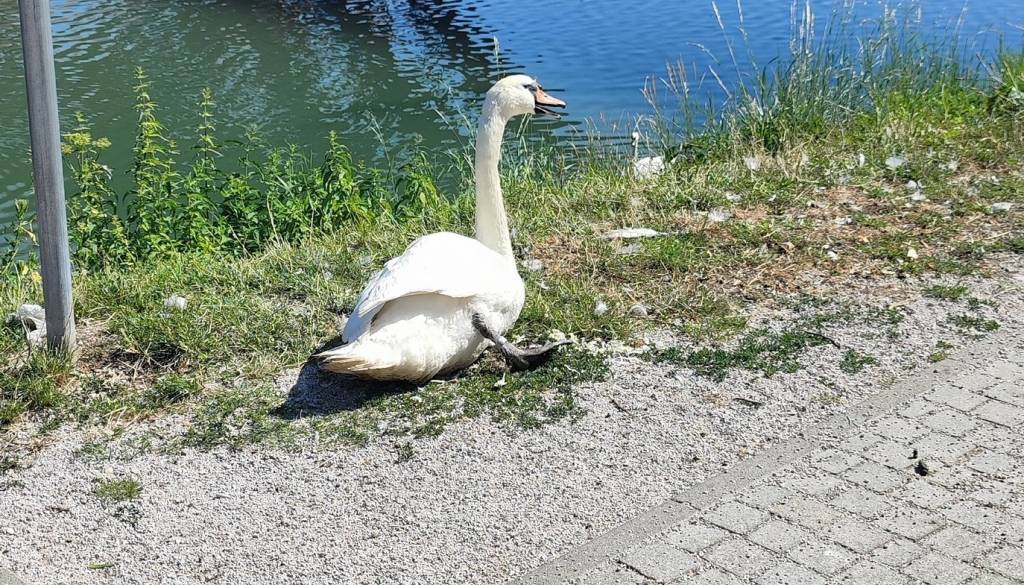 Mariborski labod s poškodovano nogo potrebuje zaščito pred mimoidočimi.