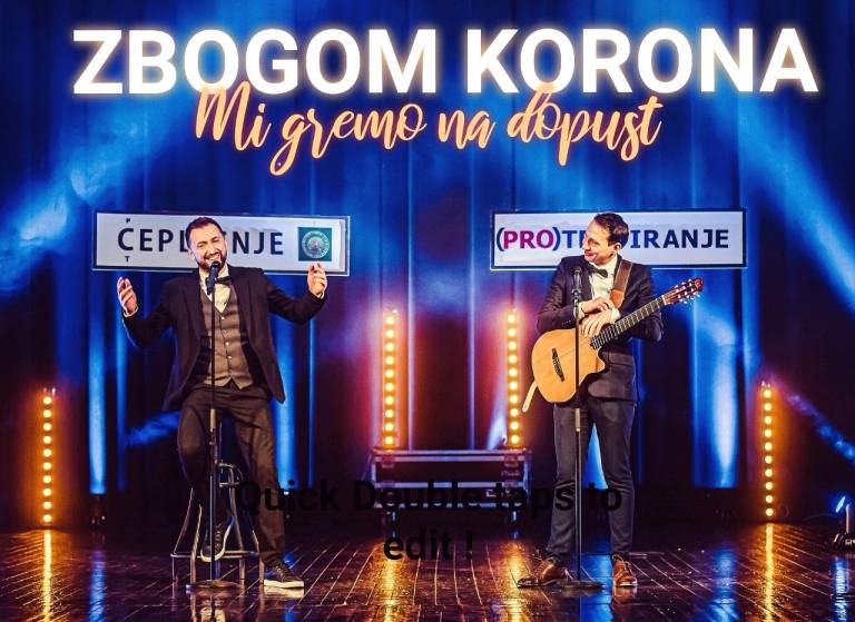 »Napočil je čas in našel je komičnega soborca - mladega, duhovitega brežiškega kantavtorja Roberta, ki mu epidemija ni odnesla nastopov, ker jih nikoli ni imel. Pogumno sta se zagnala z ukrepi prerešetanim dvoranam naproti. Potem pa se je na lepem - odprlo!,« še dodajajo in obljubljajo, da bo v smehu polni predstavi Zbogom korona, mi gremo na dopust stendapovsko-kantavtorski dinamični duo uro in pol mahal v slovo najbizarnejšemu obdobju našega življenja.