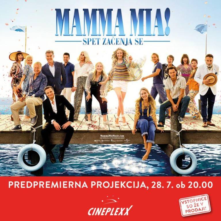 Spet je čas za petje in ples, smeh in ljubezen! Deset let po prvem delu uspešnice, ki je osvojila gledalce po vsem svetu, se filmska ekipa vrača na velika platna. Zabeležite v koledarje! Predpremierna projekcija glasbenega spektakla Mamma Mia! Spet začenja se, bo v soboto, 28. julija, v Cineplexxu Maribor.