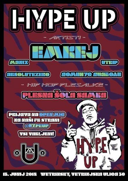 Iz temnih vod Maribora prihaja ekipa, ki bo poskrbela za vzdušje na prvem, a ne zadnjem HYPE UP eventu. Pridružil se nam bo EMKEJ s posebnim showcaseom novega albuma, imenovanega PROBAJ RAZUMET. Vzporedno bo za rap vzdušje poskrbel naš lokalni borec Utrip, ki zadnje čase posega v trap vode. Ta nam bo pokazal tudi nekaj svojega odlschool rap-a, s katerim se je podal na ulice Maribora. Z njima bodo za se bolj ulično vzdušje poskrbele hip-hop plesalke Plesna šola SAMBA. Na afterpartyu dogodka bodo za elektronsko glasbo poskrbeli DJ-i. Pridružite se nam v petek, 15. junija, ob 19.00 v Dvoru Vetrinjski. Vstopnice v predprodaji so 6 evrov, na dan dogodka 7 evrov.