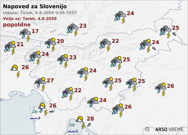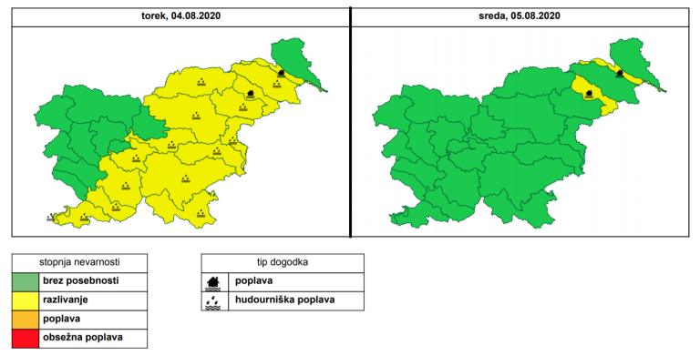 Ob močnejših nalivih lahko danes narastejo tudi manjši hudourniški vodotoki zlasti na območju južne in jugovzhodne Slovenije.