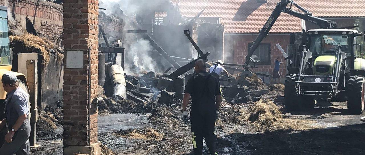 Požar, ki je predvčeraj zvečer izbruhnil v Radvencih, je uničil celotno gospodarsko poslopje, veliko štirideset krat dvajset metrov, kmetijsko mehanizacijo, štirikolesnik in avtodom ter večjo količino sena.