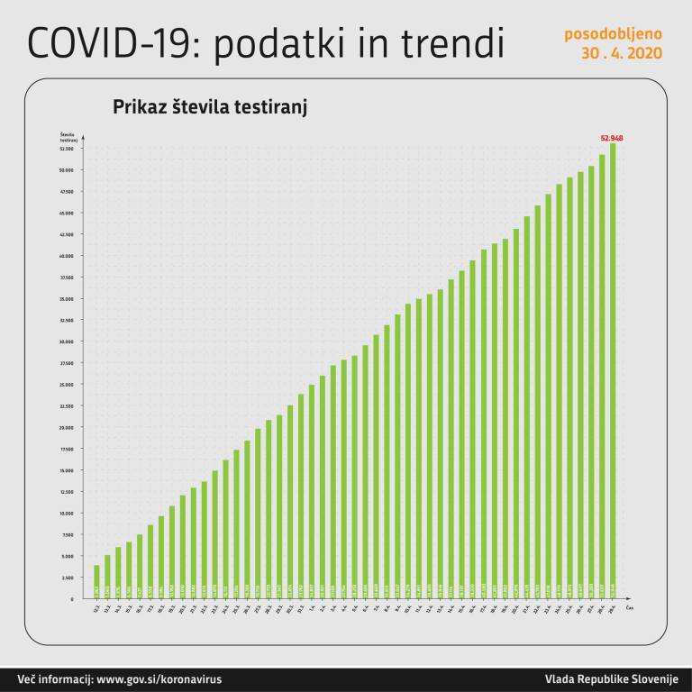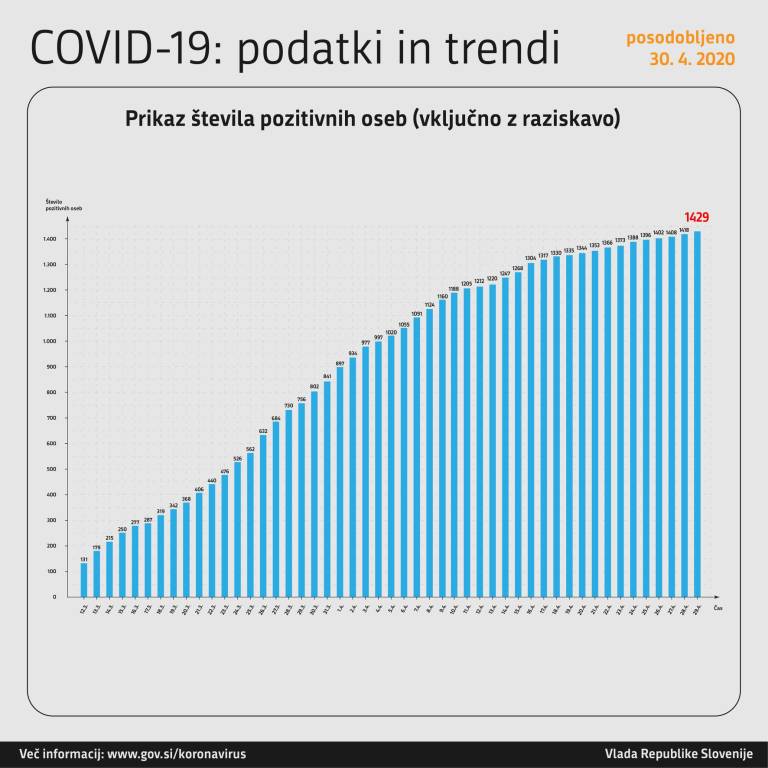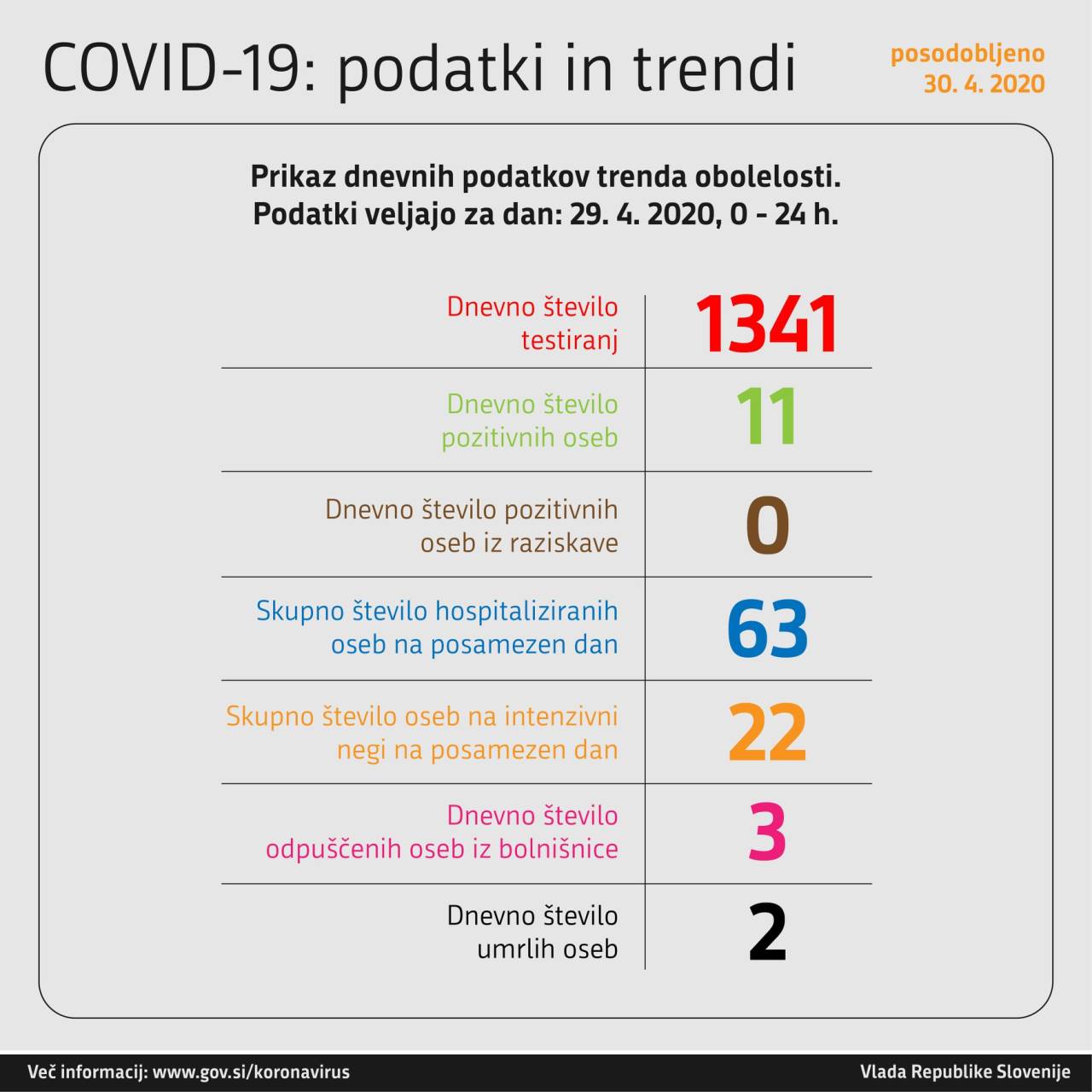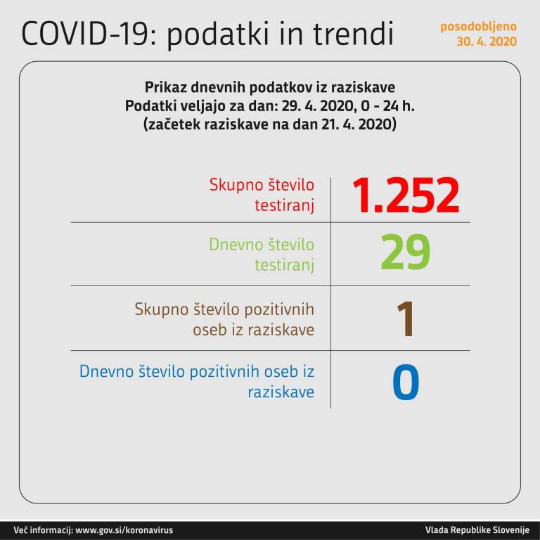 Po zadnjih podatkih, ki jih je sporočil državni vrh, je bilo včeraj v štirindvajsetih urah opravljenih 1252 testiranj, od tega jih je bilo enajst pozitivnih na koronavirus. V sklopu raziskave o prekuženosti Slovencev ni bila pozitivna niti ena od včeraj testiranih oseb. Doslej smo v Sloveniji zabeležili 1429 primerov koronavirusa.