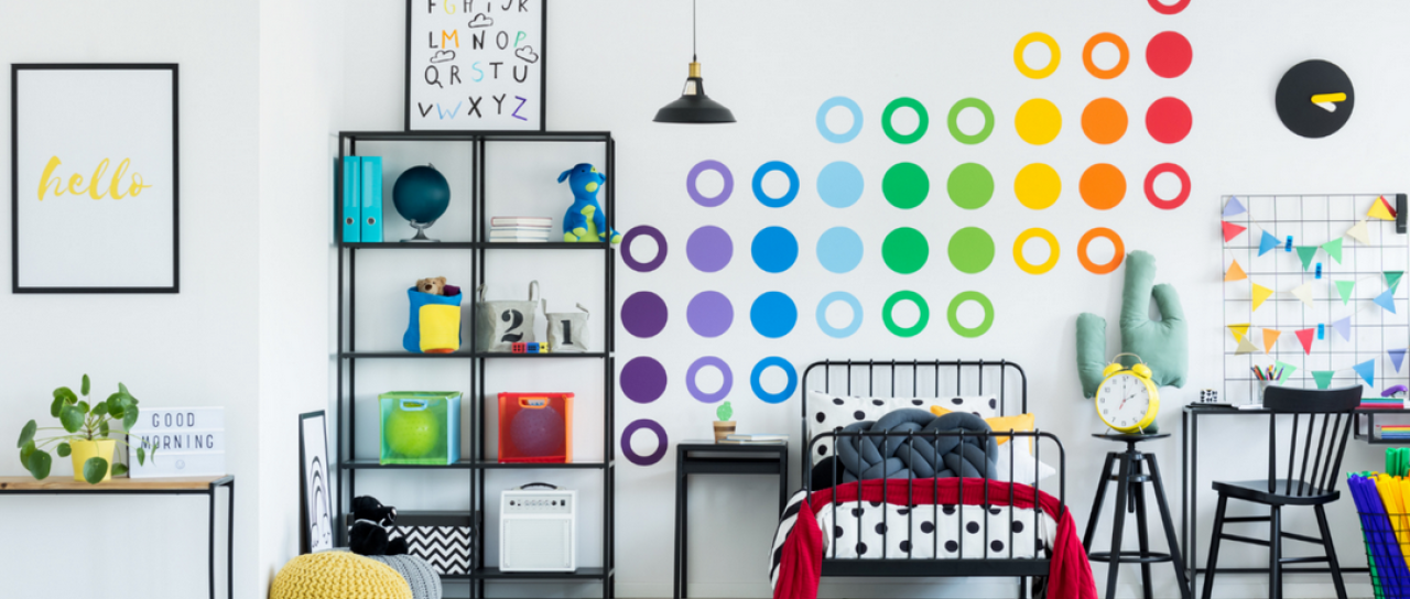 - Za estetski videz otroške sobe poskrbijo barvite stene, stenske nalepke ali tapete ter dekorativni dodatki. Barvne in asimetrične stenske police pa dajejo sobi igriv videz.