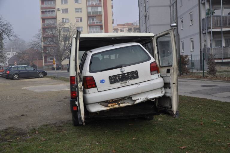 Tale nenavaden prizor je danes v jutranjih urah začudil in hkrati nasmejal prebivalce Murske Sobote. Na enem izmed parkirišč v središču mesta namreč stoji kombi, v prtljažnik katerega je stlačen avtomobil!