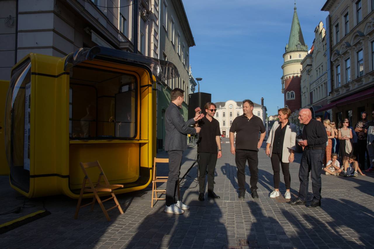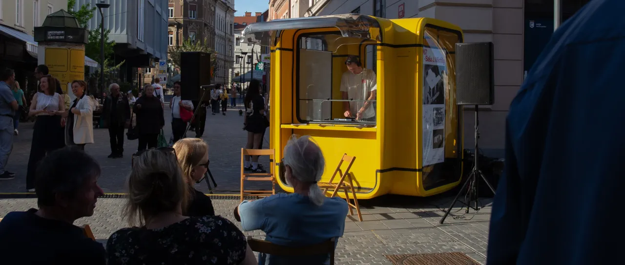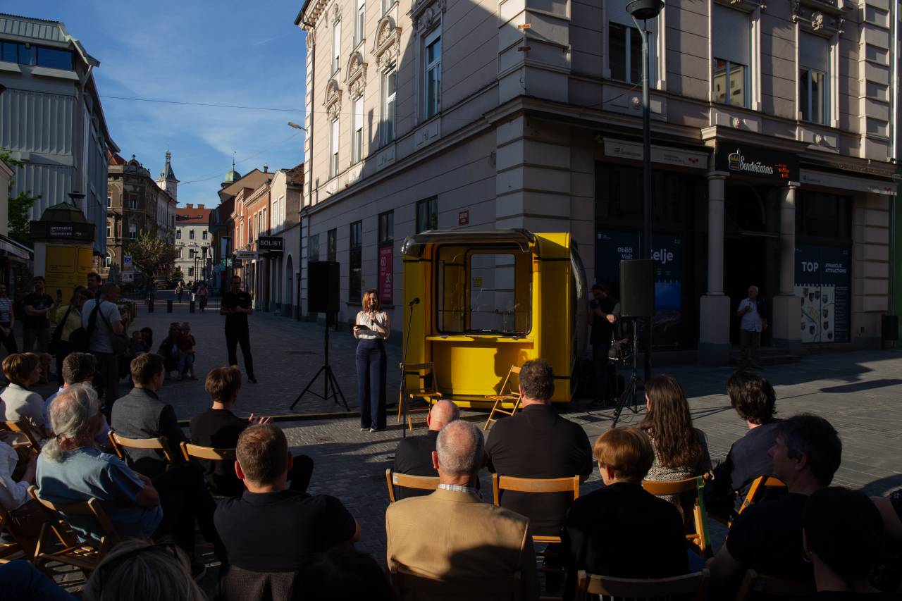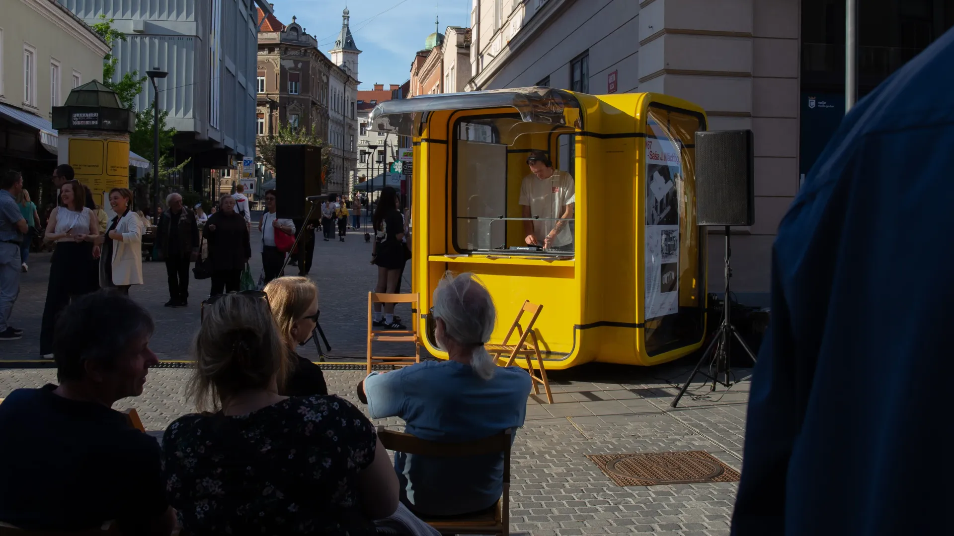 Za nagovori je sledil pogovor s Sašo J. Mächtigom, ki je podrobno opisal zgodovino kioskov in kako jih je zasnoval.