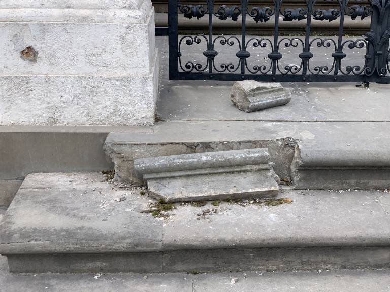 Na Glavnem trgu so vidni odkrušeni in poškodovani deli stopnišča ter kamnitih elementov pri Kužnem znamenju. Mestna občina Maribor pravi, da je s stanjem seznanjena.