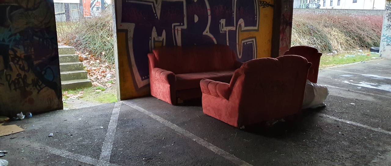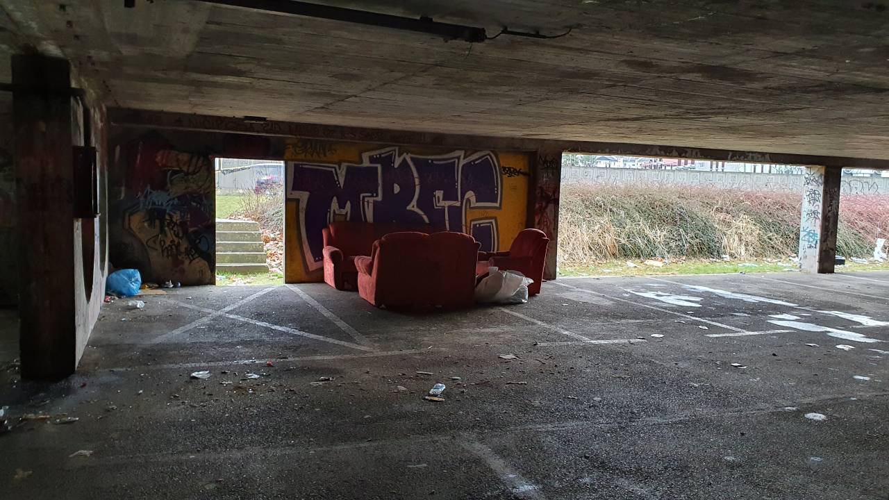 Garažna hiša v Ulici Pohorskega odreda že leta sameva. V njej lahko prej kot avte, najdemo pločevinke piva, plastične vrečke in poleg druge odpadne embalaže celo sedežno garnituro.