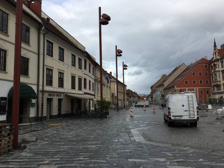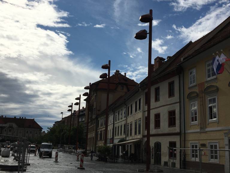 Na Glavnem trgu je že zraslo šest kandelabrov javne razsvetljave v višini petnajst metrov, kar se ujema s projektno dokumentacijo, ki jo je izdelal biro Multiplan arhitekti.