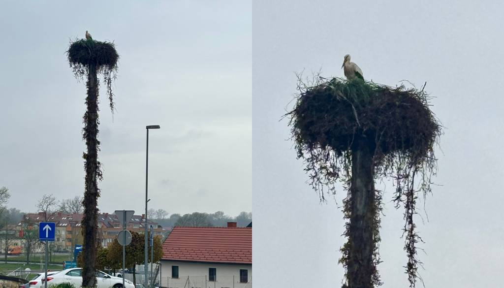 V samem središču Dupleka, visoko nad krožiščem, kjer kraljuje mogočno gnezdo na vrhu droga, se je danes v pravem zen razpoloženju nastavila štorklja.