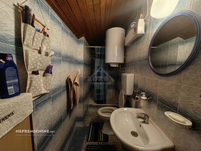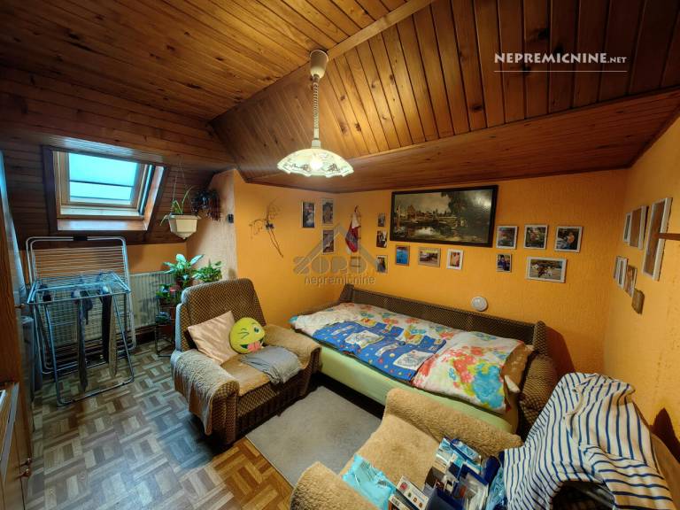 V mansardo, v katero vodijo lesene stopnice, so prostorna dnevna soba, spalnica in otroška soba oziroma kabinet.