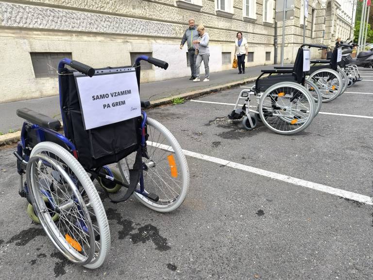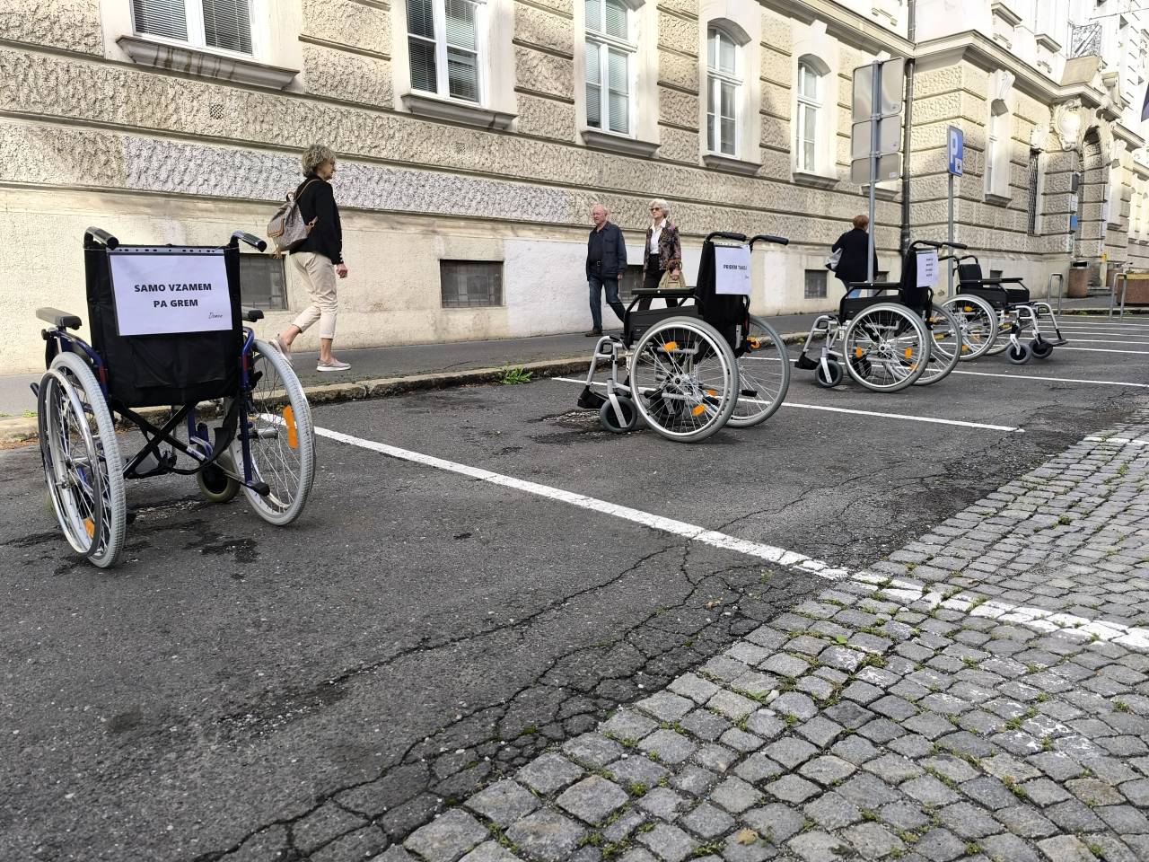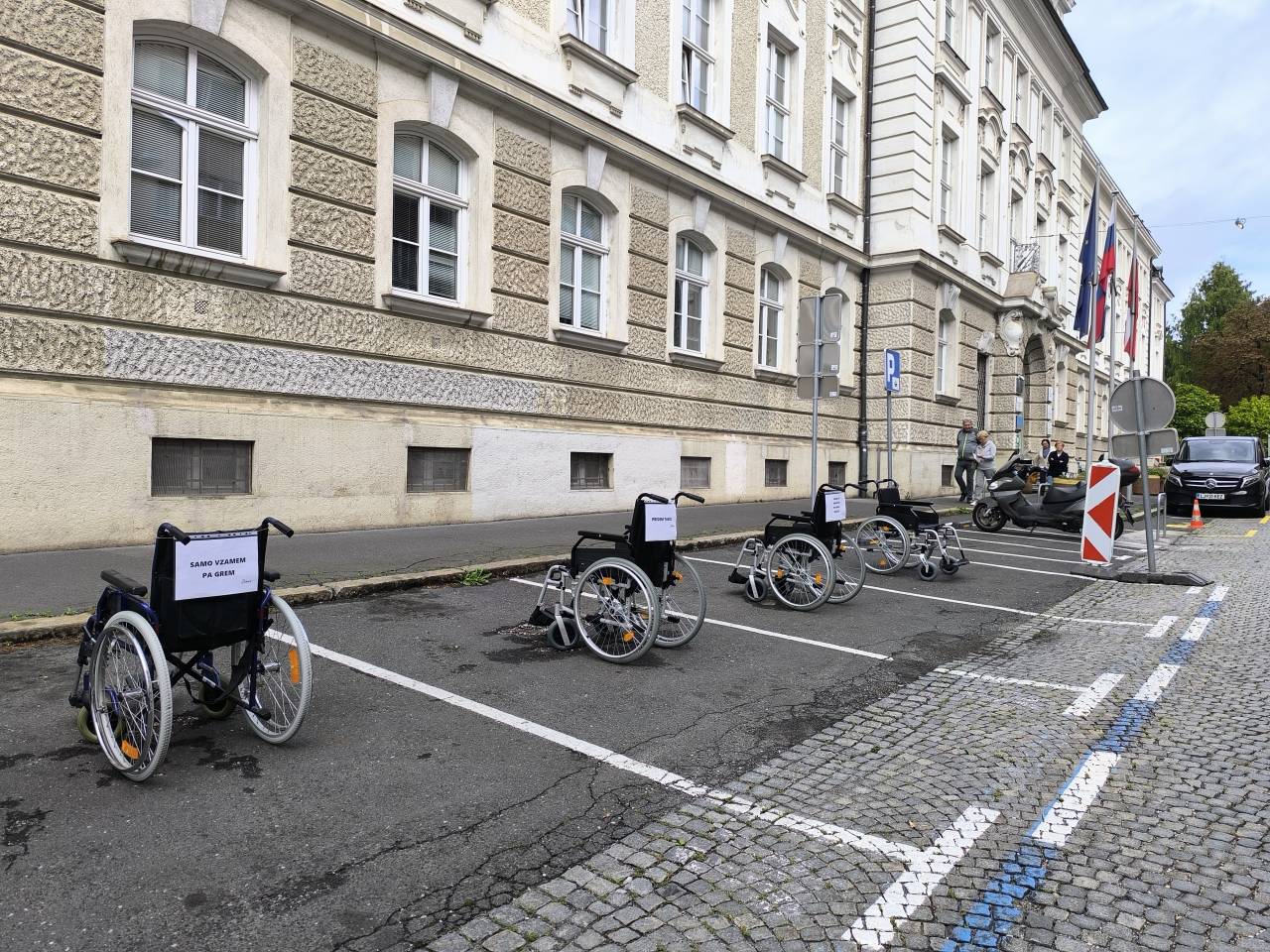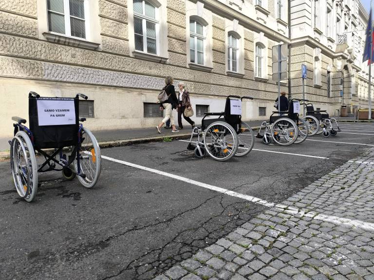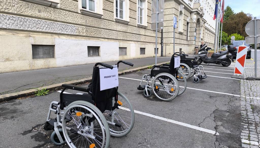 Ob dnevu mobilnosti invalidov so vozički zasedli parkirna mesta pred mariborsko občino in z napisi opozorili na neupravičeno parkiranje.