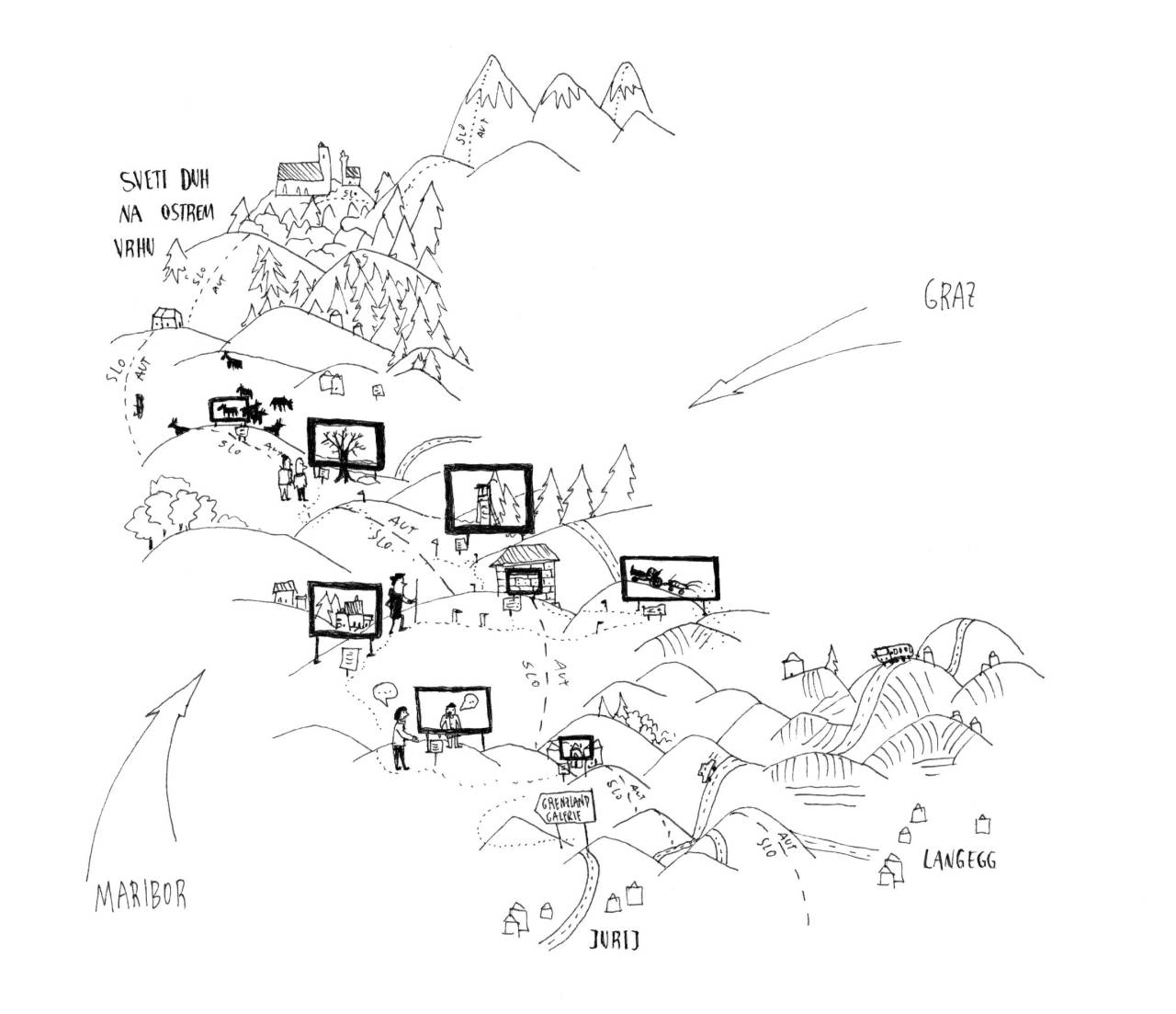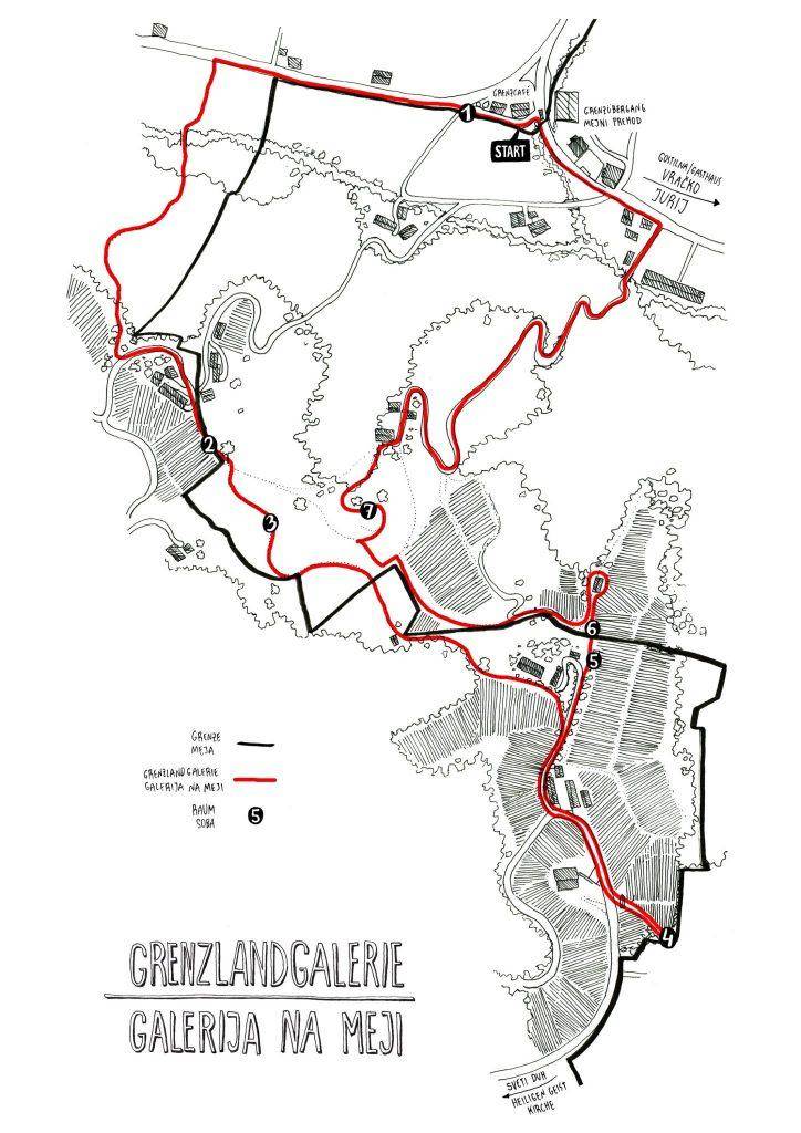 Galerija na meji obiskovalce skupaj z avdio vodičem popelje na sprehod po obmejni pokrajini med krajema Jurij ob Pesnici in Langegg an der Weinstraße. Začetna točka 4,5 kilometrov dolgega sprehoda, ki traja skoraj dve uri, na ogled pa bo še vse do 31. oktobra 2018, je na mejnem prehodu Jurij ob Pesnici – Langegg.
