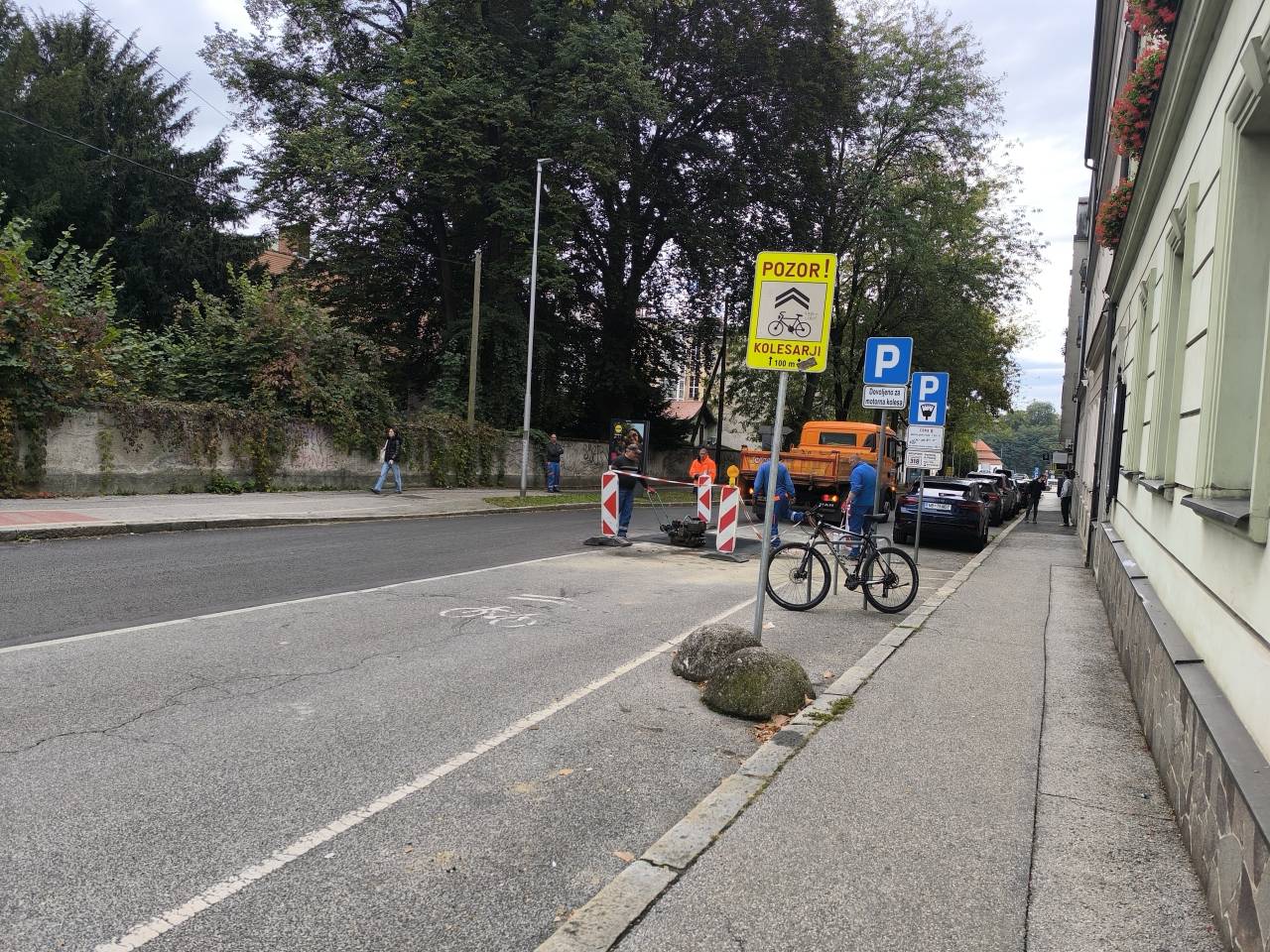 Območje je bilo označeno z začasno prometno zaporo, sestavljeno iz gradbiščnih zapornih tabel z rdeče-belimi odsevnimi pasovi.
