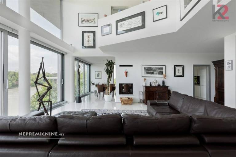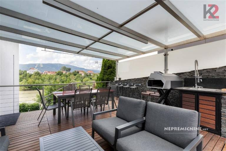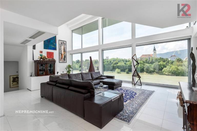 V prvem nadstropju je utility, stranišče, kuhinja, jedilnica ter odprta dnevna soba s panoramskim pogledom na reko Dravo.