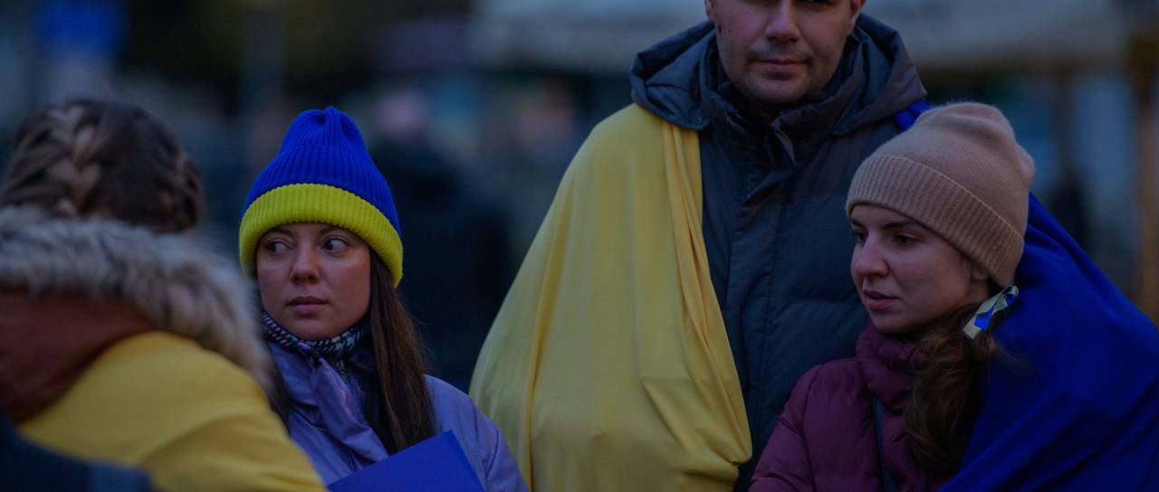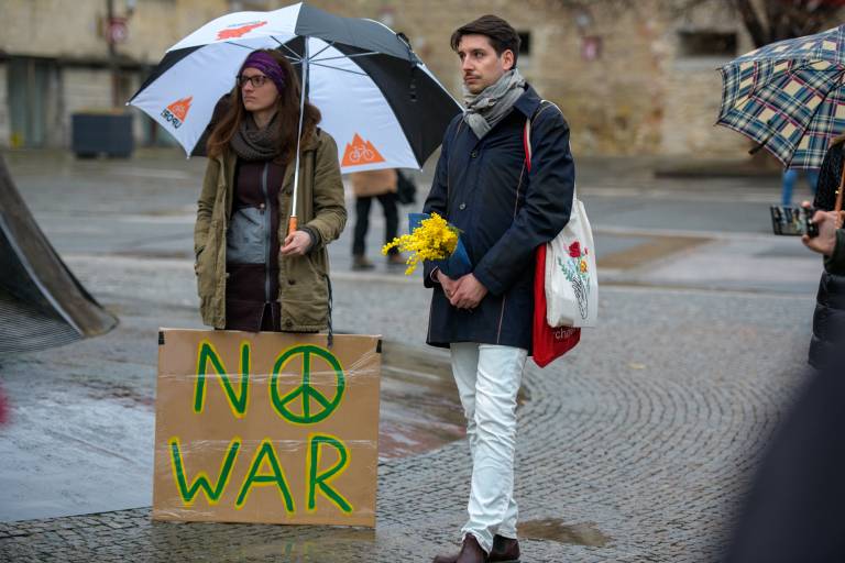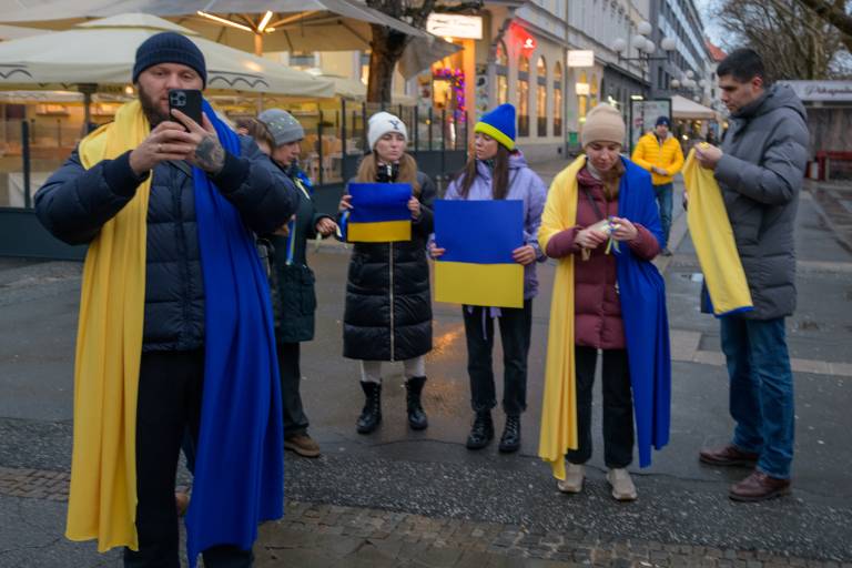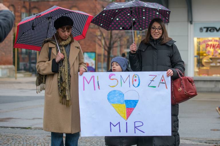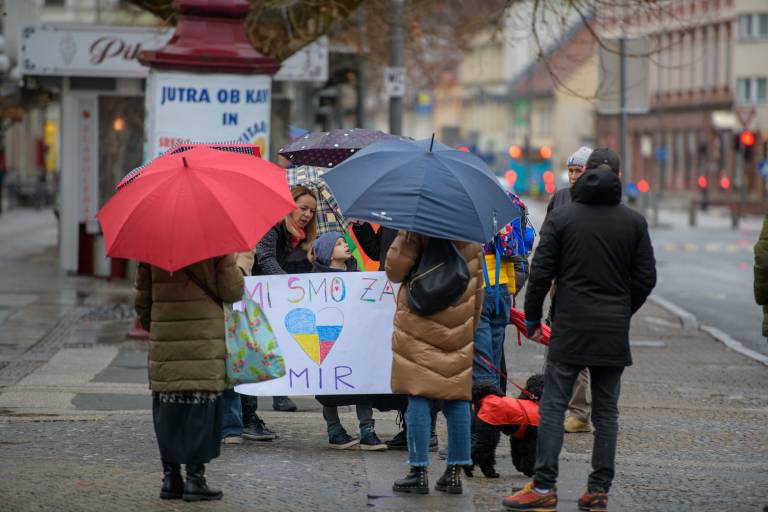 Kljub dežju se je danes, ob 17. uri, na Trgu svobode zbrala manjša množica ljudi, ki so s transparenti mirno opozarjali na nesprejemljivost dogajanja v Ukrajini.