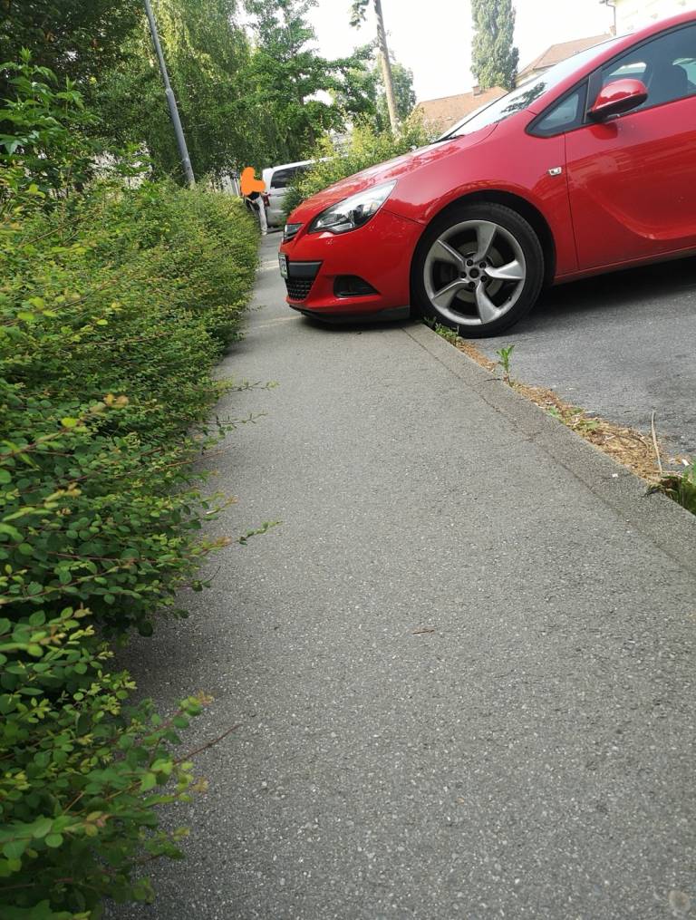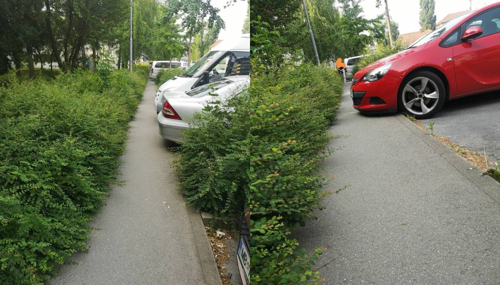 Iz fotografij je razvidno, da zeleni pasovi močno posegajo na pločnik, parkirana vozila pa dodatno zožijo prehod.